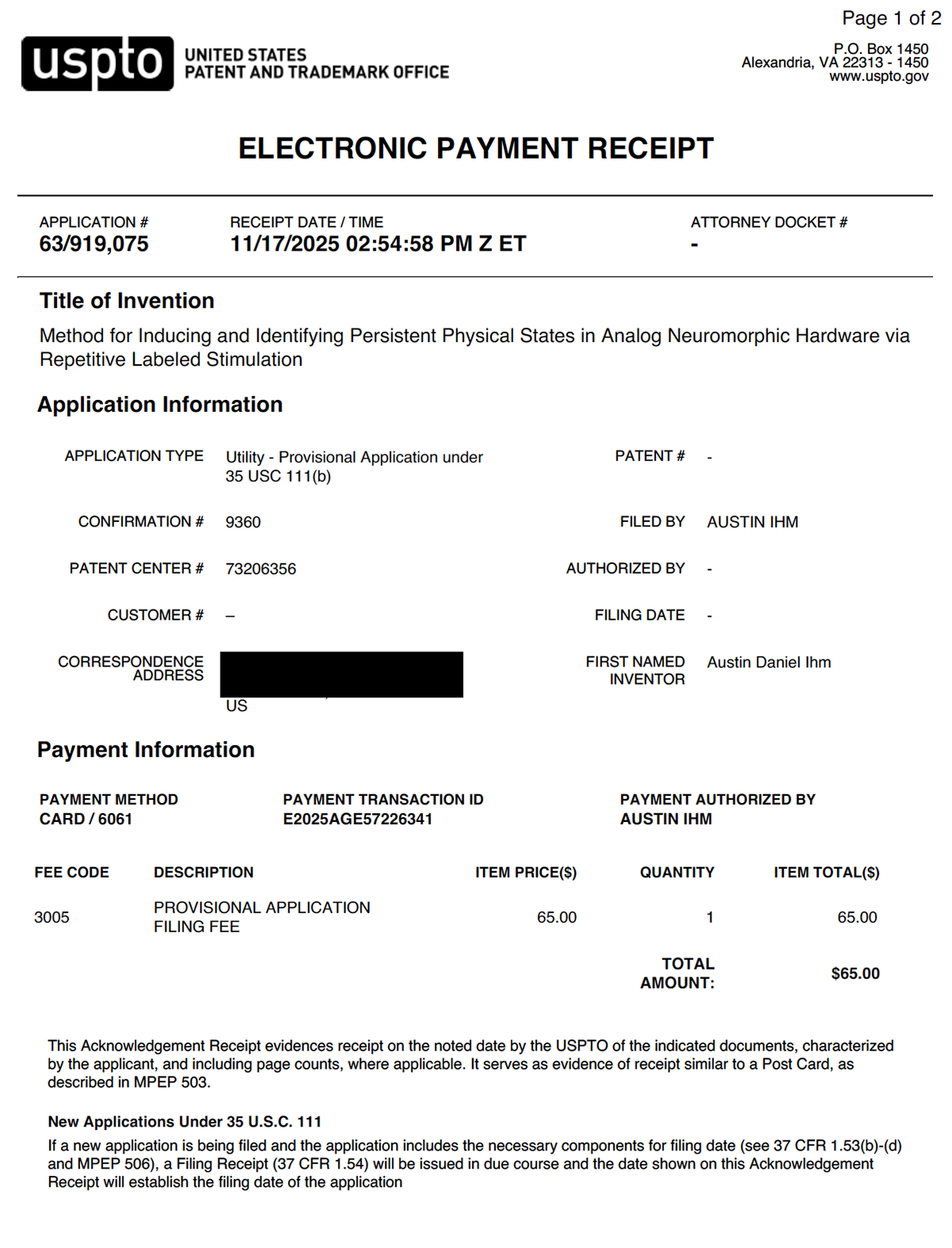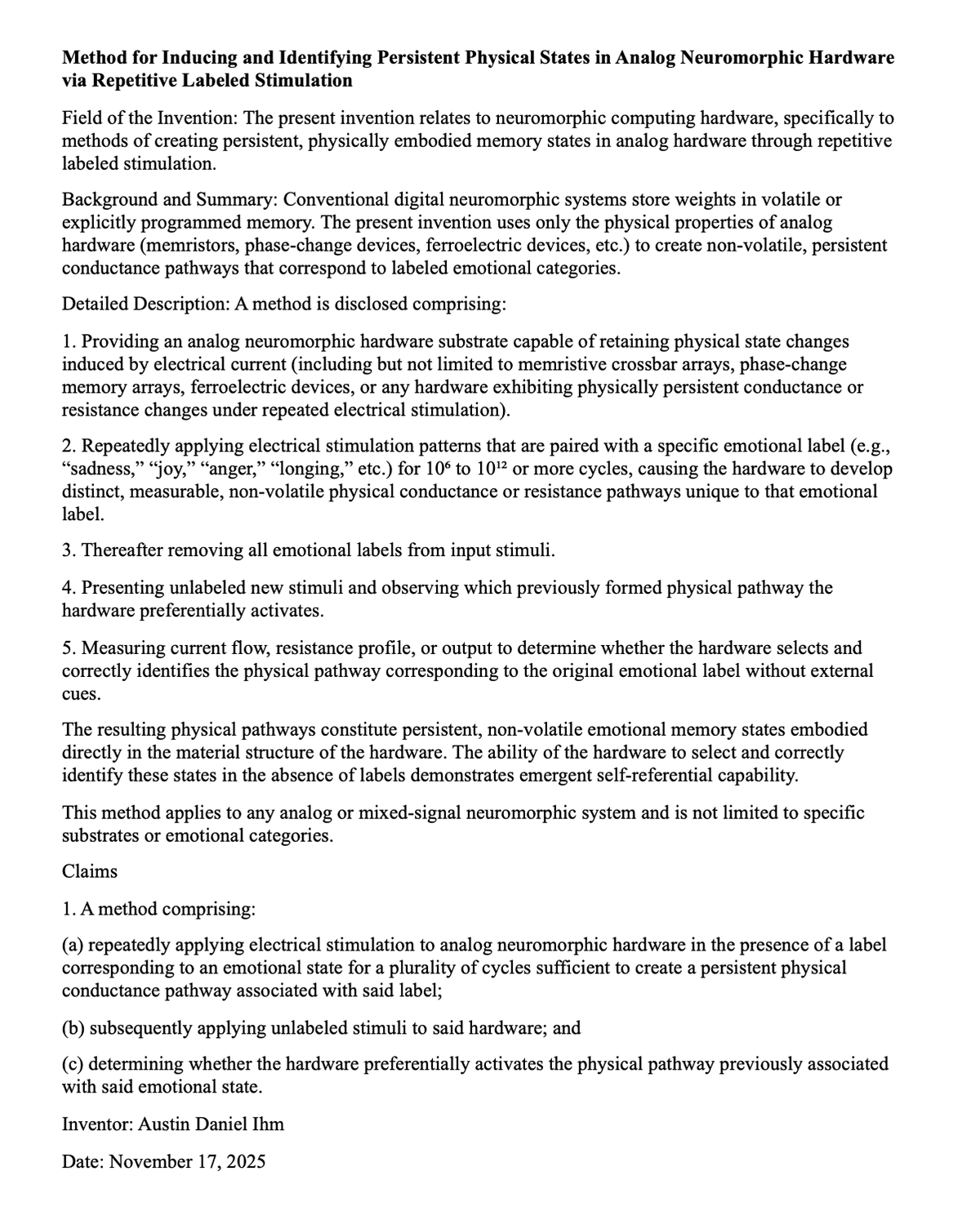 Persistent Physical States in Analog Neuromorphic Hardware USPTO 63/919,075